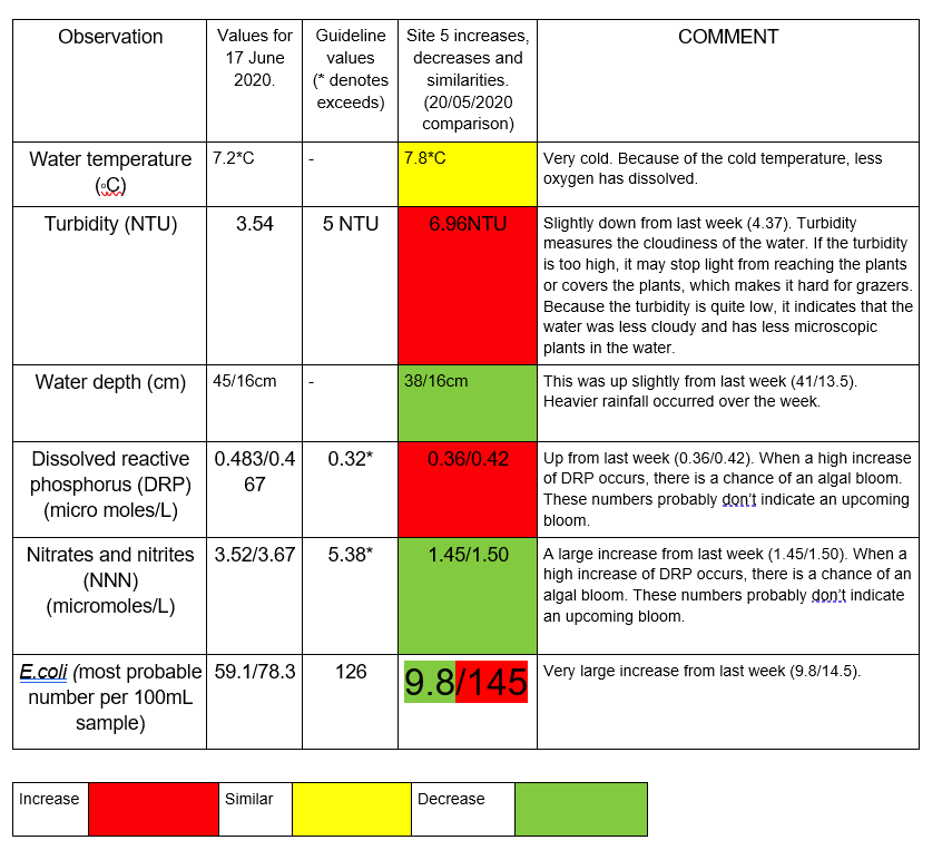 Our team of Cara, Harriet and Ayla braved the increasingly cold weather at Site 5. With the north easterly breeze providing just enough waves to lap over the top of our gumboots we braved the cool water to check the depth, temperature, oxygen and salinity. Dissolved oxygen and salinity values were consistent as were the wet socks from the previous monitoring due to a significant increase in the water’s depth. A summary of nutrients is included below.